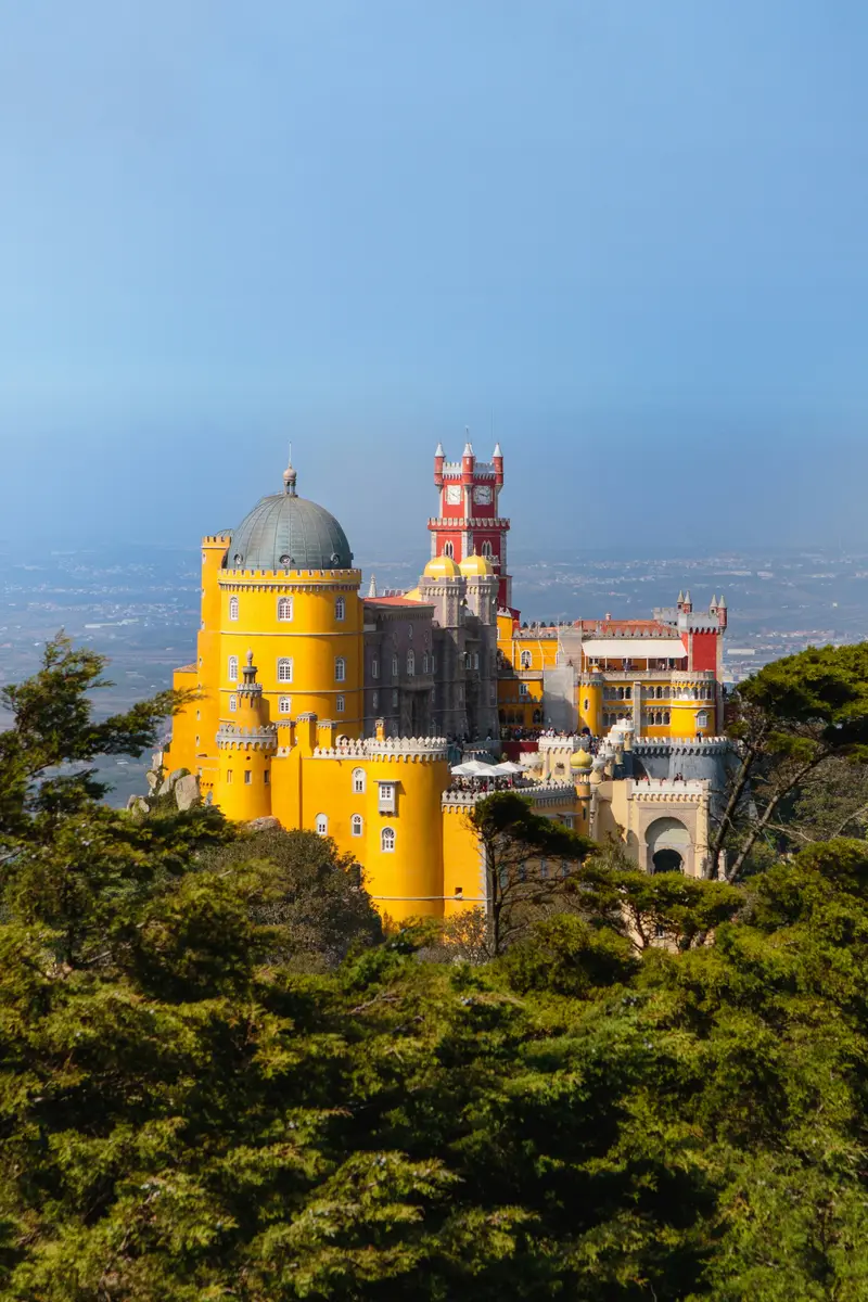 Pena Palace is the 19th-century royal summer residence perched on a forested hill above Sintra, 530 metres above the Atlantic. Its painter-bright yellow and red towers, Manueline cloisters, and Moorish battlements make it one of the most photographed buildings in Europe — and the first of the great Romantic palaces of the era.